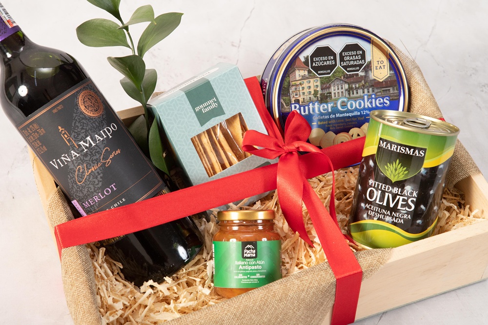 Canasta de madera en pino que contiene botella de vino tinto (750 ml), grissinis con queso parmesano (90g aprox), miel artesanal (130 ml), carnes maduradas (30g) y galletas de mantequilla
